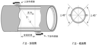 DN200~6000mm的管道優(yōu)先選用Z法,在V法測不到信號(hào)或信號(hào)質(zhì)量差時(shí)也可選用Z法。安裝時(shí)讓兩個(gè)傳感器之間沿管軸方向的垂直距離等于安裝距離,并且保證兩個(gè)傳感器在同一軸面上即可,并注意發(fā)射方向一定相對(duì)(兩個(gè)傳感器方向朝里)。由于Z法是超聲波在介質(zhì)傳播中直接收發(fā),信號(hào)沒有反射,因而信號(hào)強(qiáng)度衰減最小。所以,Z法信號(hào)強(qiáng)度較高,適用于口徑較大、介質(zhì)含雜質(zhì)或氣泡、管道有結(jié)垢等超聲波信號(hào)衰減較大的場合