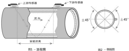 兩個(gè)傳感器應(yīng)該安裝在管道軸面的水平方向上,在45°范圍內(nèi)安裝,以防止上部有不滿管、氣泡或下部有沉淀等現(xiàn)象影響傳感器正常測量。