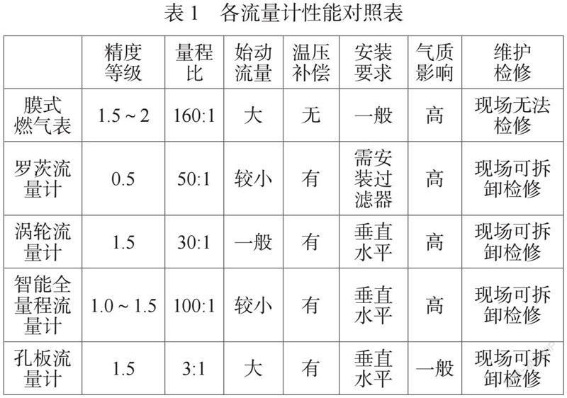 表1是針對以上流量計從它們計量精度、量程、始動流量、溫壓補償、安裝要求、維護與檢修等方面進行比較。